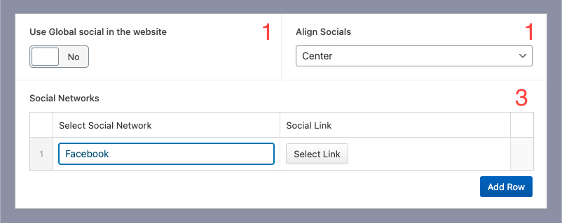 1.- Turn On to use the Socials from Global, or Custom Socials from Social networks fields from this Block
